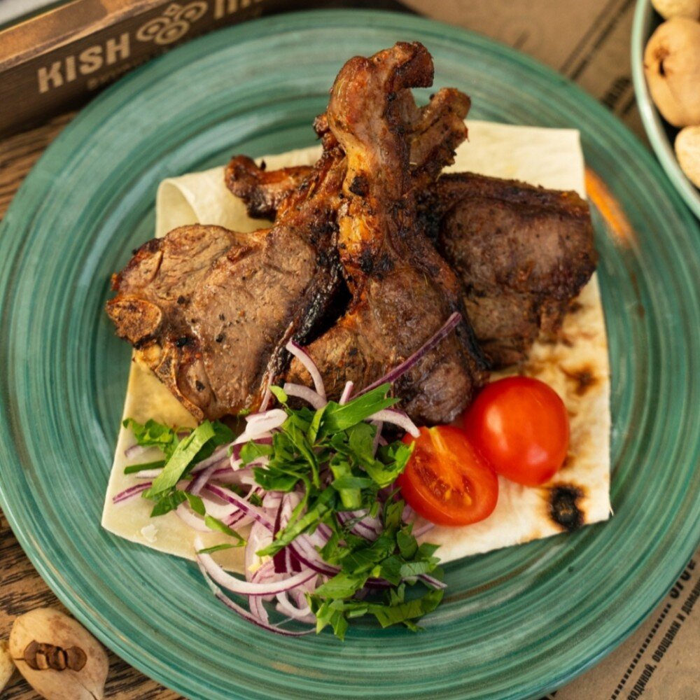 Жаренный на углях шашлык из мяса ягненка без кости, с маринованным луком, овощным салатом и томатным соусом P.S. С соусом вкуснее