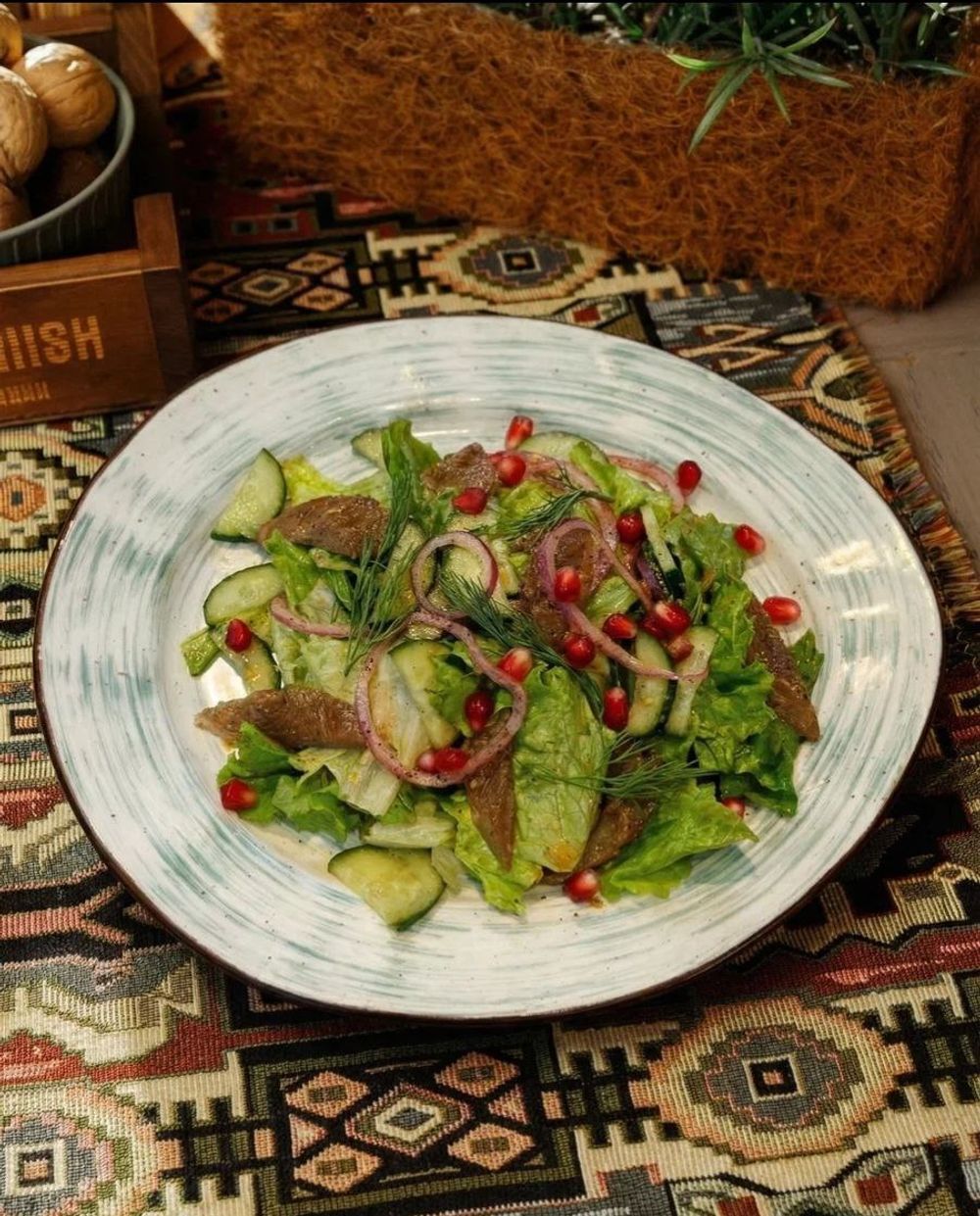 Лист салата, корюшка, огурец, лук красный, гранат, зелень, соевый соус, мёд, соус с апельсином