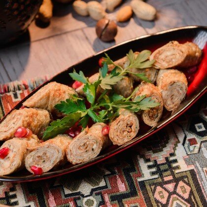 Мясное ассорти из ростбифа, куриных рулетиков с курогой, говяжьего отварного языка и домашней ветчины. Подается с майонезно-горчичным соусом. P.S. с лепёшкой вкуснее