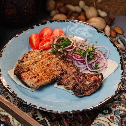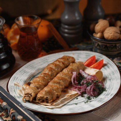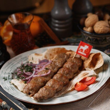 Люля из свинины и телятины, подается с лавашом, помидорами черри и свежим красным луком с зеленью P.S. С соусом вкуснее