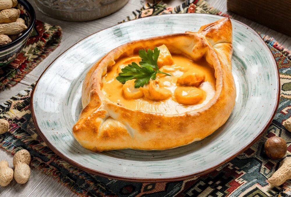 Хачапури в виде лодочки с сыром, гребешком, креветками и ароматным соусом "Том-Ям"
