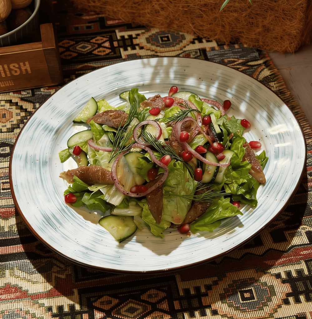 Лист салата, корюшка маринованная, огурец свежий, красный лук, гранат, зелень, заправка на основе горчицы и апельсинового сока