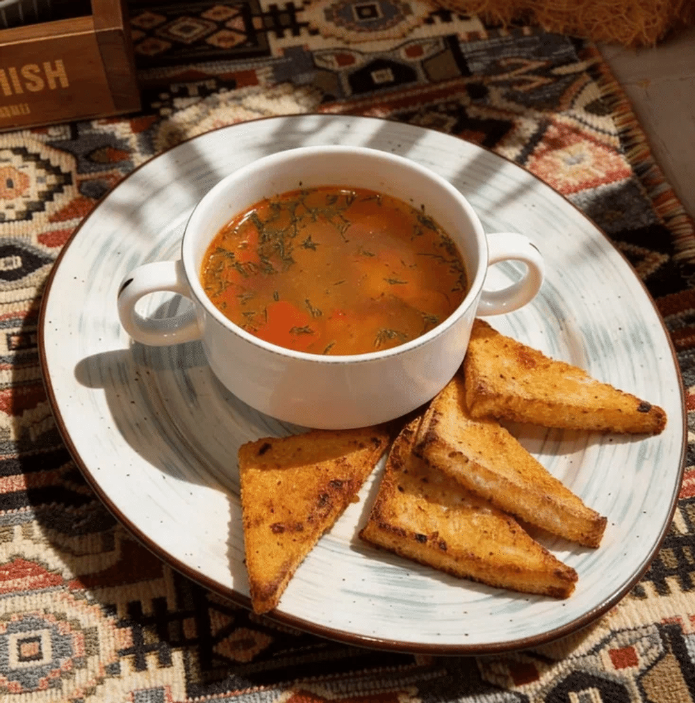 Ароматная уха с лососем, картофелем, болгарским перцем, томатами и луком, пикантная из-за аджики и черного перца. Подаем с сухариками.