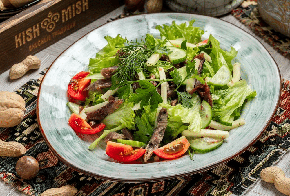 Салат из свежих овощей,петрушки и укропа, запечённой говядины, сыра сулугуни, с соусом из растительного масла и уксуса