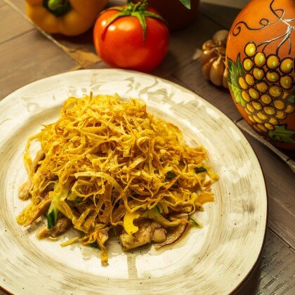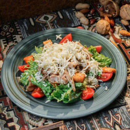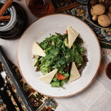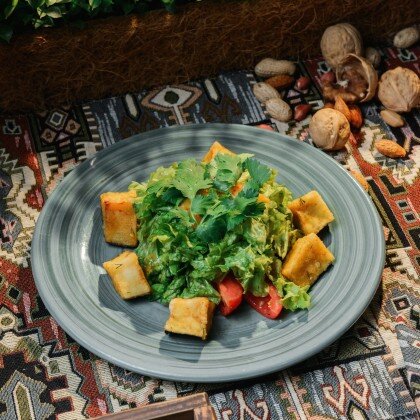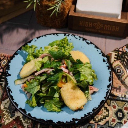 Салат с копченым цыпленком и жареным сыром сулугуни