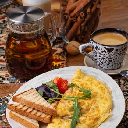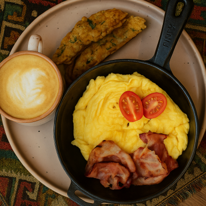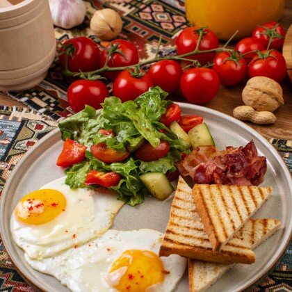 Роскошная шакшука из трех яиц на основе сочных томатов и болгарского перца, с луком и кинзой. Подаем с хрустящими тостами.