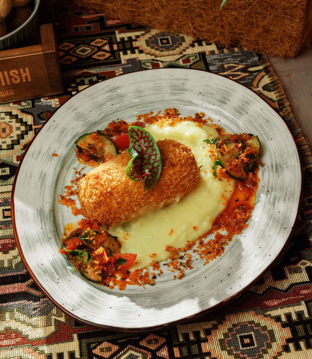 Котлета по-киевски из трески с картофельным пюре и овощной сальсой